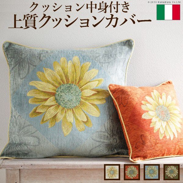 商品について:イタリア製のクッションカバー(中身付き)。絵画のような表情を見せる大輪のマーガレット柄をお部屋のアクセントに。