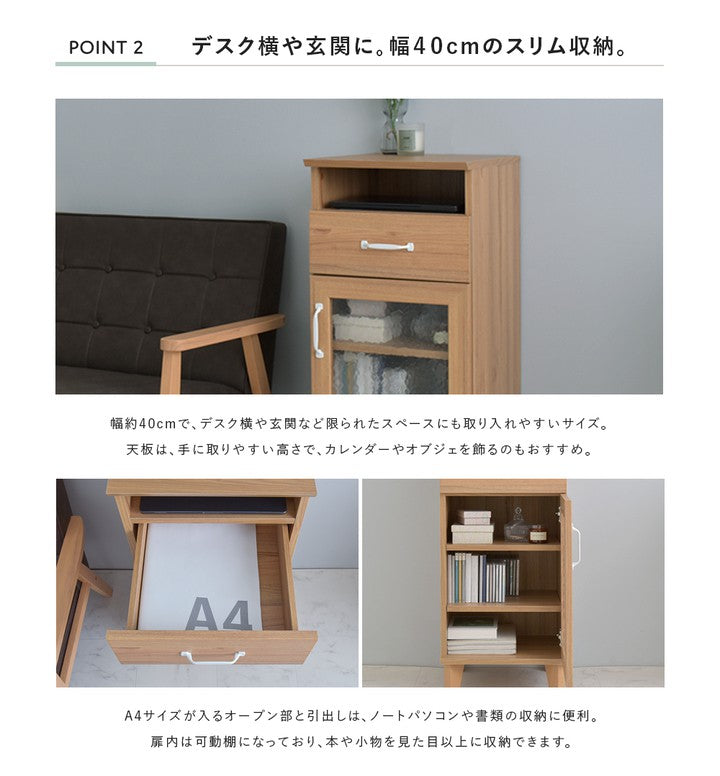 キャビネット スリム 木製 サイドボード 白 ナチュラル 北欧 ガラス扉 リビング 収納 リビングボード 幅40 収納棚 扉付き 薄型 脚付き 引き出し a4 おしゃれ 書類収納 電話台 整理 間仕切り 壁面 書類 ロー 棚 本 ラック 木