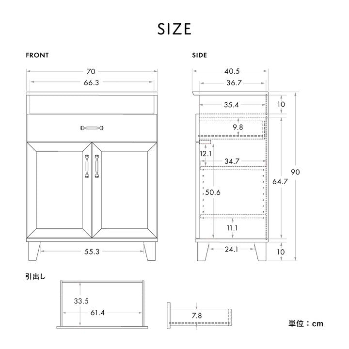 耐荷重 | 天板:約20kg 棚板:約7kg 引出し:約5kg |