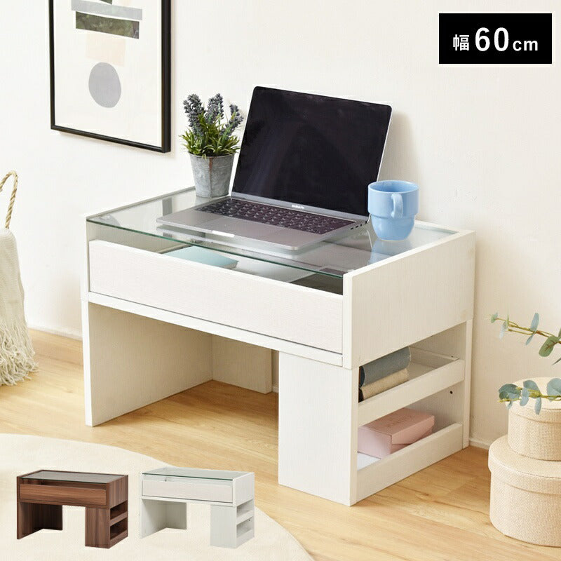デスク 机 引き出し 収納 棚 ラック ガラス シンプル 幅60 ロータイプ 木製 スリム 木目 薄型 奥行35 パソコン テレワーク 在宅 コンパクト 小型 おしゃれ パソコンデスク 省スペース 天板 低い ロー 在宅勤務 小さめ 木