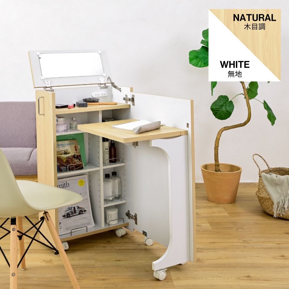 ドレッサー デスク 収納 コンパクト 白 2つ口コンセント ワゴン 鏡 スリム 折りたたみ キャスター 兼用 棚 化粧台 薄型 1面 大容量 木製 ミラー おしゃれ デスクドレッサー 北欧 コンセント リビング 移動式 2way 1面鏡