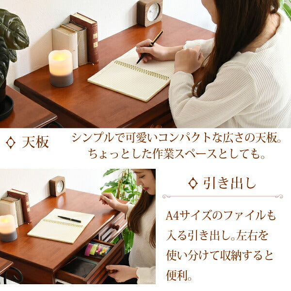 チェアと揃えて、ヨーロピアンなお部屋を作る女性らしいアイテム。A4サイズが収納できる引き出しが2杯ついていて、デスク面は幅広い設計のためパソコンデスクとしても学習机としてもご使用いただけます。